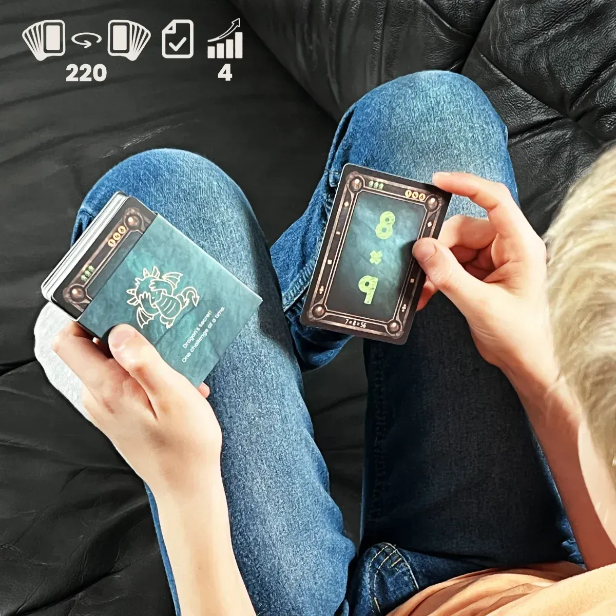 Dein Kind löst eine Aufgabe, dreht die Karte um, sieht die richtige Antwort und lächelt. Es spielt auf seinem eigenen Niveau, überprüft die Ergebnisse selbst und möchte weitermachen.