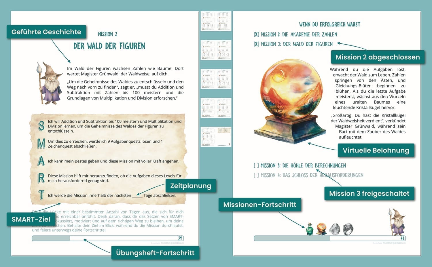 Das Questbuch ist eine Einführung in größere Abenteuer. Jede seiner vier Missionen entspricht einem der vollständigen 8-Missions-Übungshefte der Mathepotamia Mathe-Abenteuer-Serie (Level 1 bis 4). Jede Mission ist auch auf ein Schwierigkeitslevel des Mathepotamia Brettspiels abgestimmt, so weißt du, welches Arbeitsheft für dein Kind am besten geeignet ist und wo es im Spiel selbstbewusst beginnen kann.