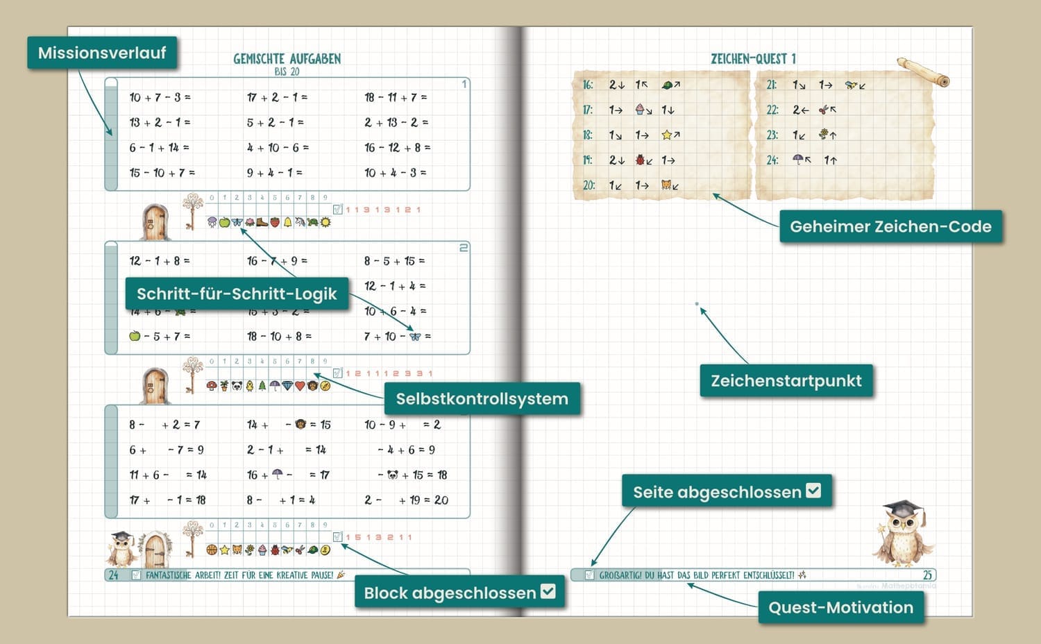 Das Questbuch ist dein erster Schritt in die Mathepotamia-Welt. Es folgt dem gleichen spielerischen Lernansatz wie unsere Mathepotamia Mathe-Abenteuer 4-Bücher-Serie und kombiniert Missionen, selbstkontrollierende Aufgaben und spielerische Belohnungen, die Kindern helfen, mit Vertrauen zu lernen.